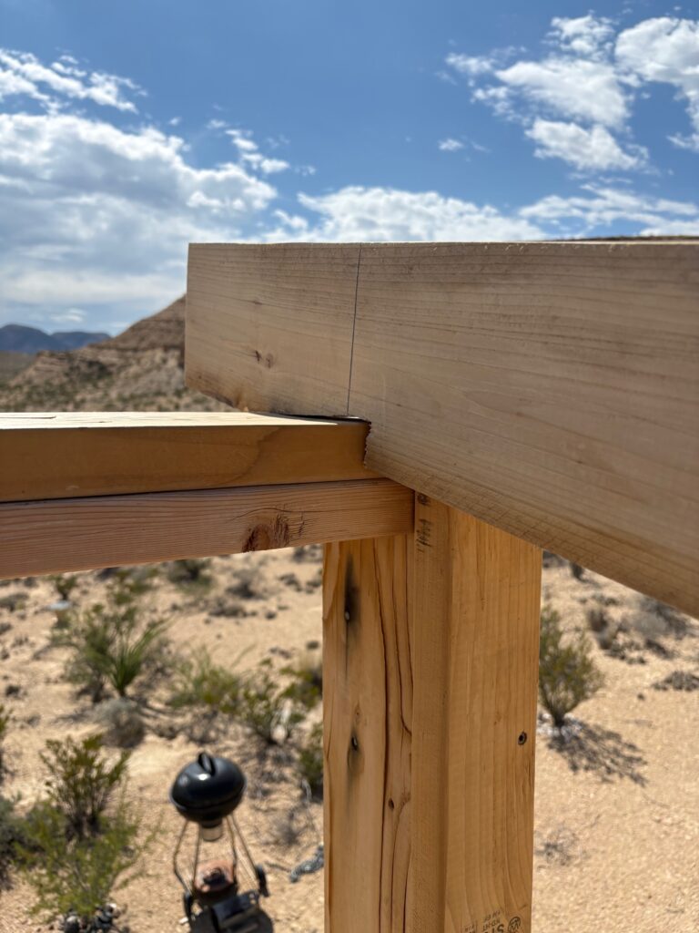 My bird mouth cuts took about 3 hours to replicate and I was really happy how consistent they were. No joist hangers seen because I used 7′ SPAX powerlag structural bolts. I have our first on site amazon order coming tomorrow that will include old school metal hurricane ties. Again, overkill but its cheap 25$ piece of mind when the wind starts blasting.