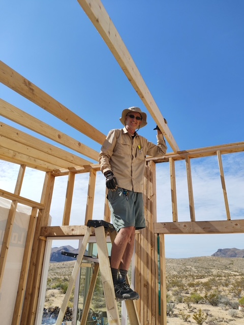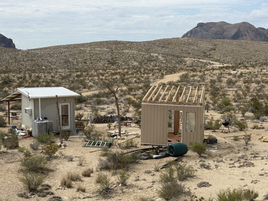I trailered the lumber for the front wall, side wall, plus 1 of 2 sliding glass doors and window but somehow still needed to make a run for more lumber in Alpine. The build work went smoothly but I had to get my neighbor, Kyle, to help me lift the front wall since its 2×6 lumber instead of 2×4 like the other walls. With most of that wall being sliding glass doors, I wanted to over engineer that wall. Next trip I hope to get the doors, windows and siding installed and possibly start on the roof.