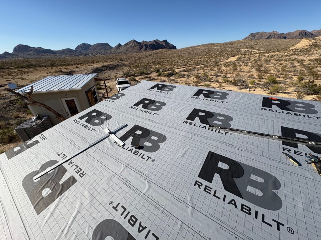 I used Reliabilt Ice and Water sheild underlayment on top of the decking. It’s basically a roll of gooey tar that is covered with a water proof fabric. It sticks to the roof (and itself!) and self seals any penetrations like the roof screws.